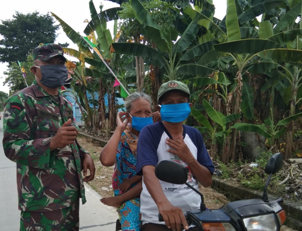 Upaya Satgas TMMD Reg Ke-107 membagi masker kepada warga desa Kedungsari dalam rangka upaya pencegahan menularnya virus corona.ini merupakan anjuran pemerintah.