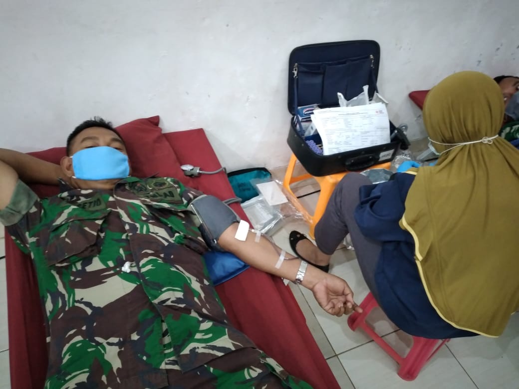 Kudus- Disela-sela kesibukannya mensukseskan TMMD Reguler ke-107 Kodim 0722/Kudus di Desa Kedungsari, Kecamatan Gebog, Kabupaten Kudus, Jawa Tengah, sejumlah anggota Satgas TMMD meluangkan waktu untuk mengikuti bakti sosial donor darah, di Kantor Kodim Kudus. Rabu (8/4/2020).