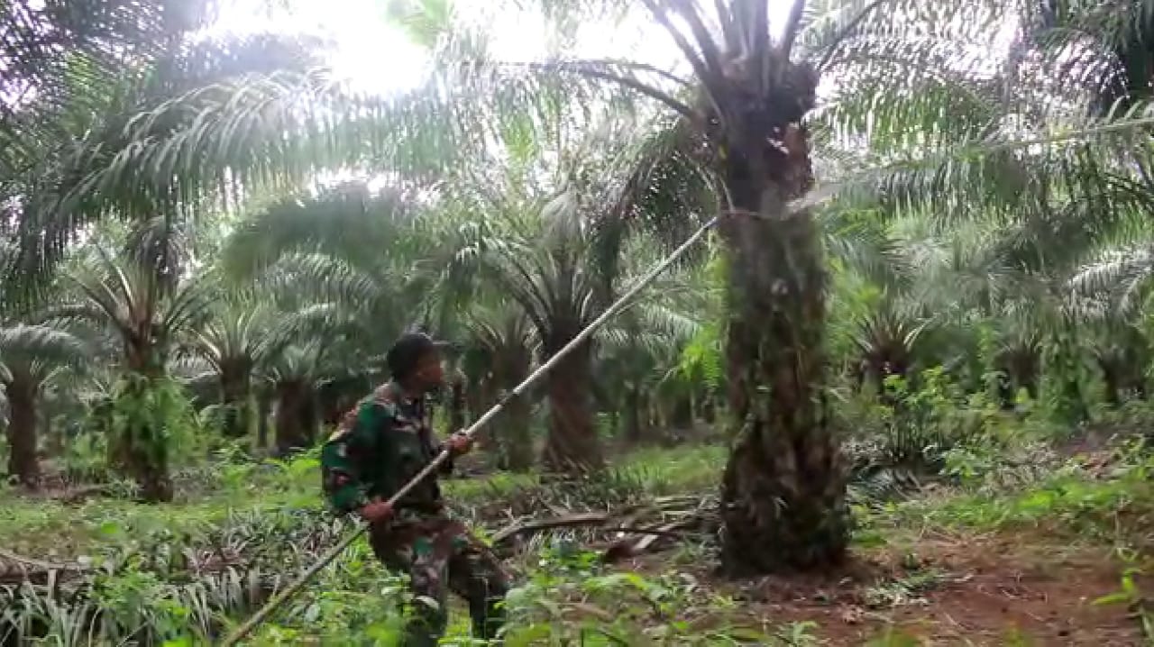 Keinginan membantu panen buah sawit merupakan bentuk perhatian dan kepedulian personil Satgas TMMD untuk meringankan beban petani. (*)