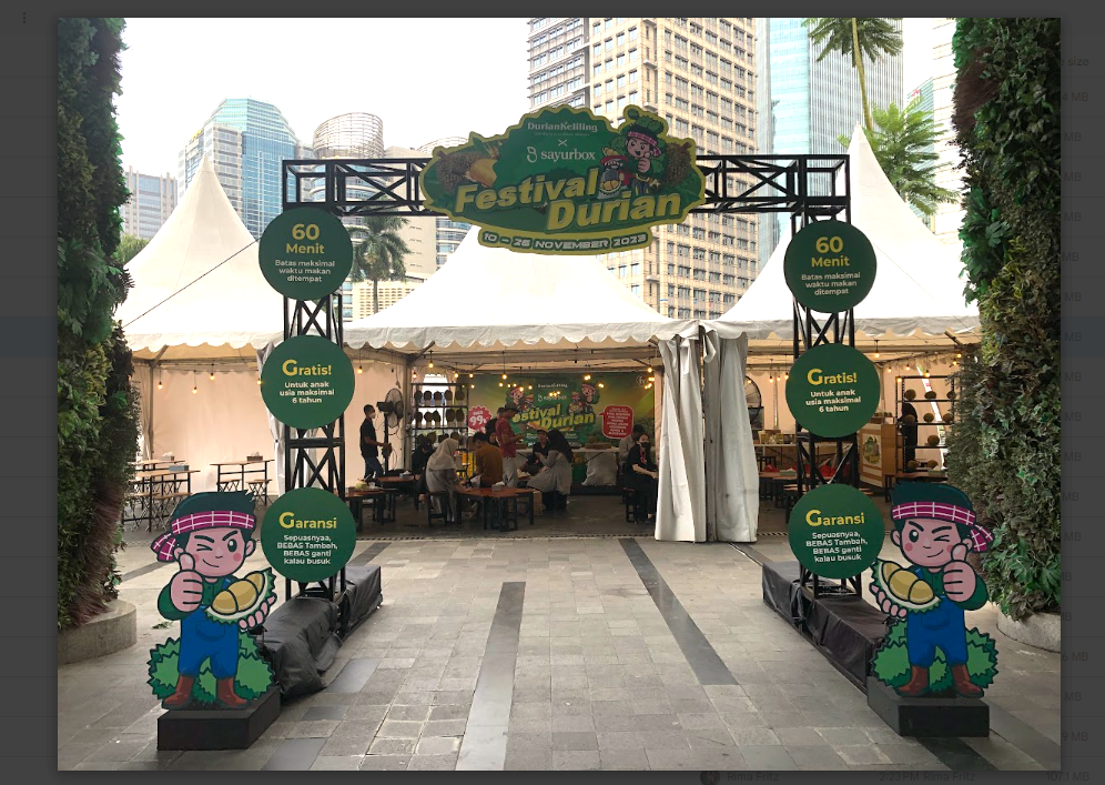 Durian Festival Sayurbox di FX Senayan merupakan kesempatan langka untuk menikmati durian dengan harga yang sangat terjangkau. Festival ini akan diadakan mulai pukul 10.00 hingga 22.00 setiap hari selama periode 10-26 November 2023. Selama acara pengunjung dapat menikmati sepuasnya durian berkualitas dengan harga yang terjangkau. Tidak hanya itu, Sayurbox juga menawarkan pilihan All You Want Eat beragam olahan durian yang lezat seperti Pancake Durian, Soes Durian, Es Cendol Durian, Es Krim Durian serta masih banyak lainnya.