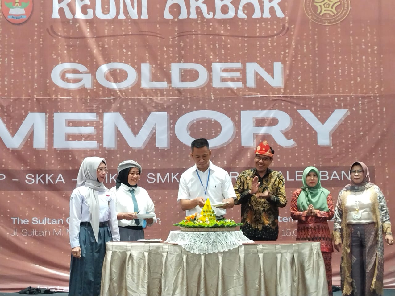 Palembang, newshanter.com – Staf Ahli Gubernur Sumatera Selatan (Sumsel) bidang Kemasyarakatan dan Sumber Daya Manusia (SDM) Sekretariat Daerah (Setda) provinsi Sumsel Drs Nelson Firdaus, M.M yang mewakili Pemerintah Provinsi (Pemprov) Sumsel menerima nasi tumpeng dari acara reuni Akbar “Golden Memory” SGKP, SKKA, SMKK, SMK Negeri 6 Palembang yang dipusatkan di The Sultan Convention Center, Sabtu (30/9/2023).