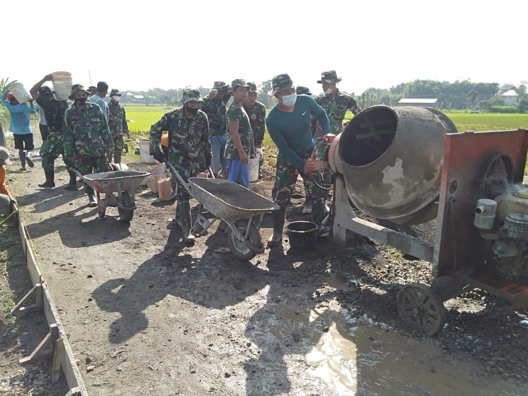 Satgas TMMD Reguler Ke-111 Ta. 2021 Kodim 0718/Pati, melaksanakan gotong royong pengecoran jalan bersama masyarakat Desa Tamansari, Kecamatan Jaken, Kabupaten Pati.