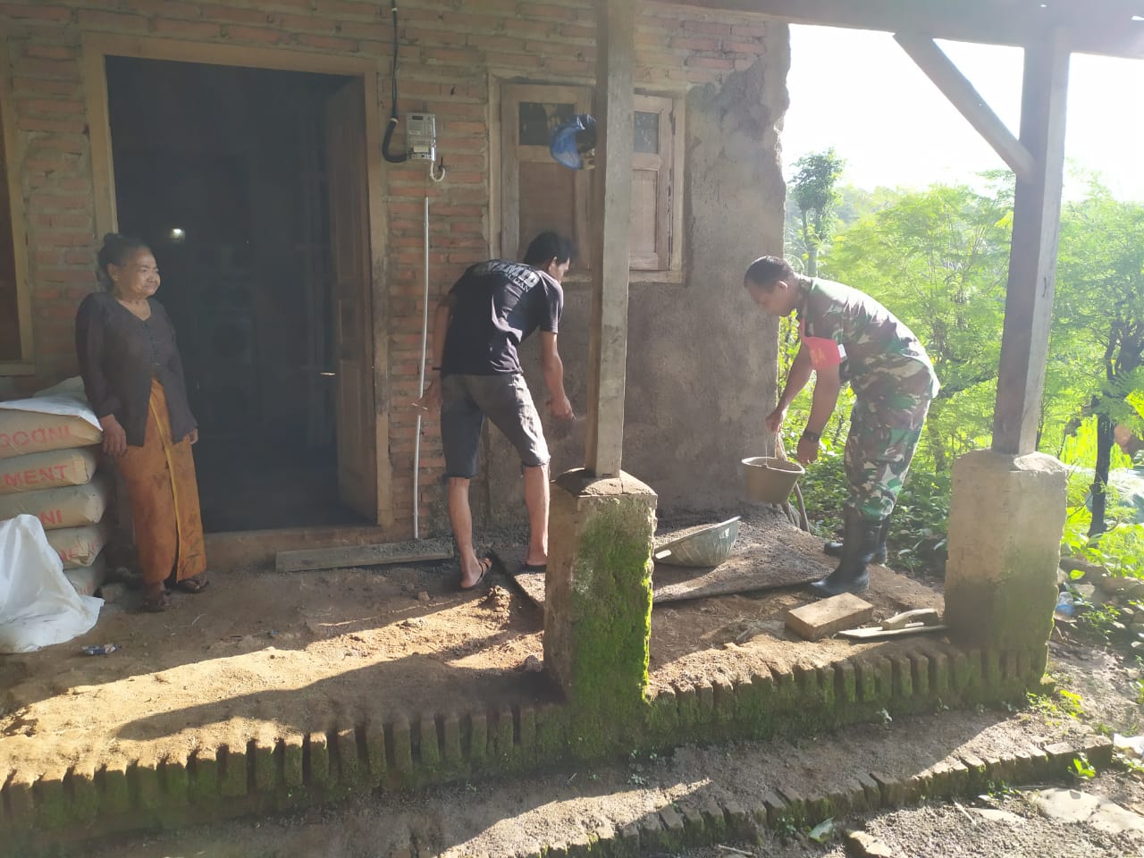 Rumah Mbah Wagimah yang saat ini sedang di rehab dengan plesteran dinding yang sedang di kerjakan oleh Anggota Satgas TMMD,kami mencoba untuk konfirmasi dengan beliau tentang rumahnya yang dapat bantuan untuk di rehab.Mbah Wagimah mengatakan”Matur nuwun sanget sampun direwangi pak tentara, griyane kulo sakniki sampun sae ( terima kasih sekali, di bantu Pak Tentara rumah saya sekarang sudah bagus),”Kata Mbah Wagimah yang polos.