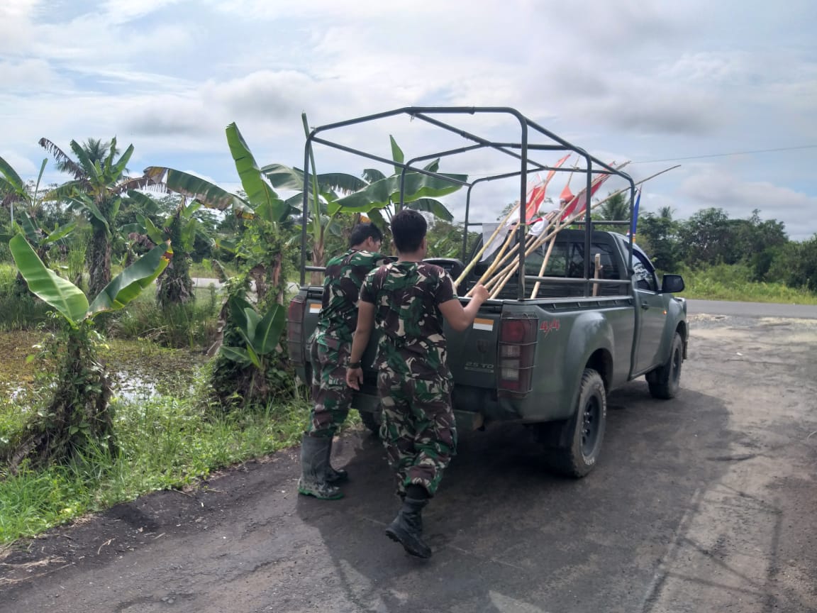Kapuas,- Sebelum melakukan pemasangan bendera umbul-umbul, Anggota Satgas TMMD ke 110 Kodim 1011/KLK, menyiapkan bambu untuk memasang umbul-umbul di sepanjang jalan Desa Saka Lagun, Kecamatan Pulau Petak, Kebupaten Kapuas, Selasa (30/3/2021).