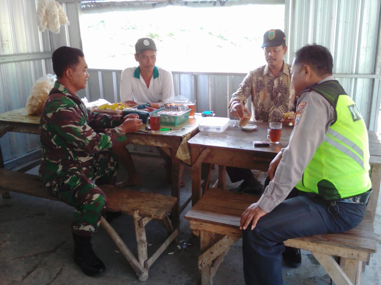 KUDUS, NH- Tampak terlihat santai antara TNI dan Polisi menikmati hidangan dari warga Desa Kedungsari yang tidak jauh dari lokasi TNI Manunggal Membangun Desa Reguler ke-107 Kodim 0722/Kudus saat santai. Rabo 11/3/2020