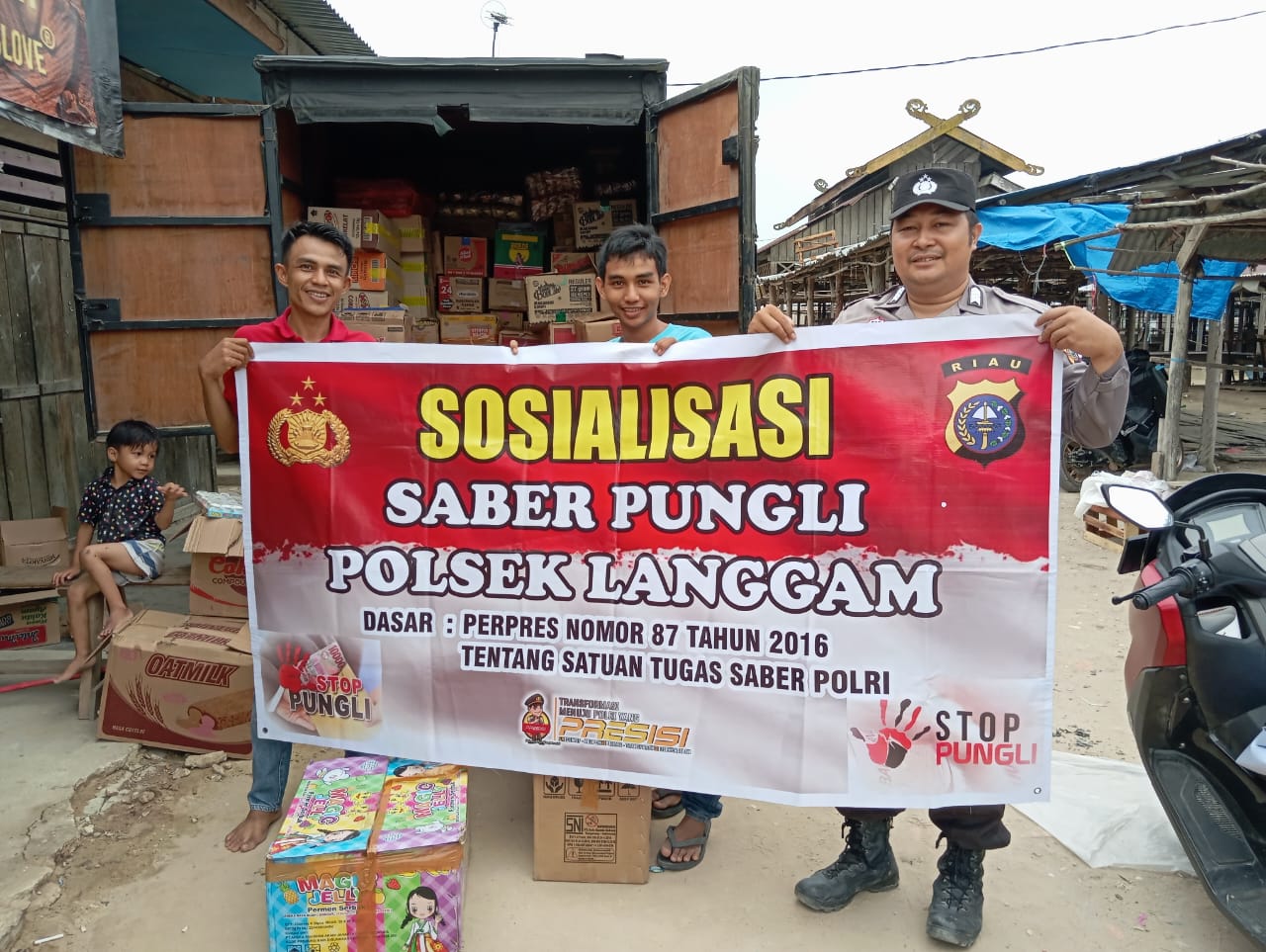 PELALAWAN, NEWSHANTER.COM – Polsek Langgam Polres Pelalawan Polda Riau, gencar melakukan sosialisasi sapu bersih pungutan liar (saber pungli) kepada masyarakat, Senin (3/10/2023).