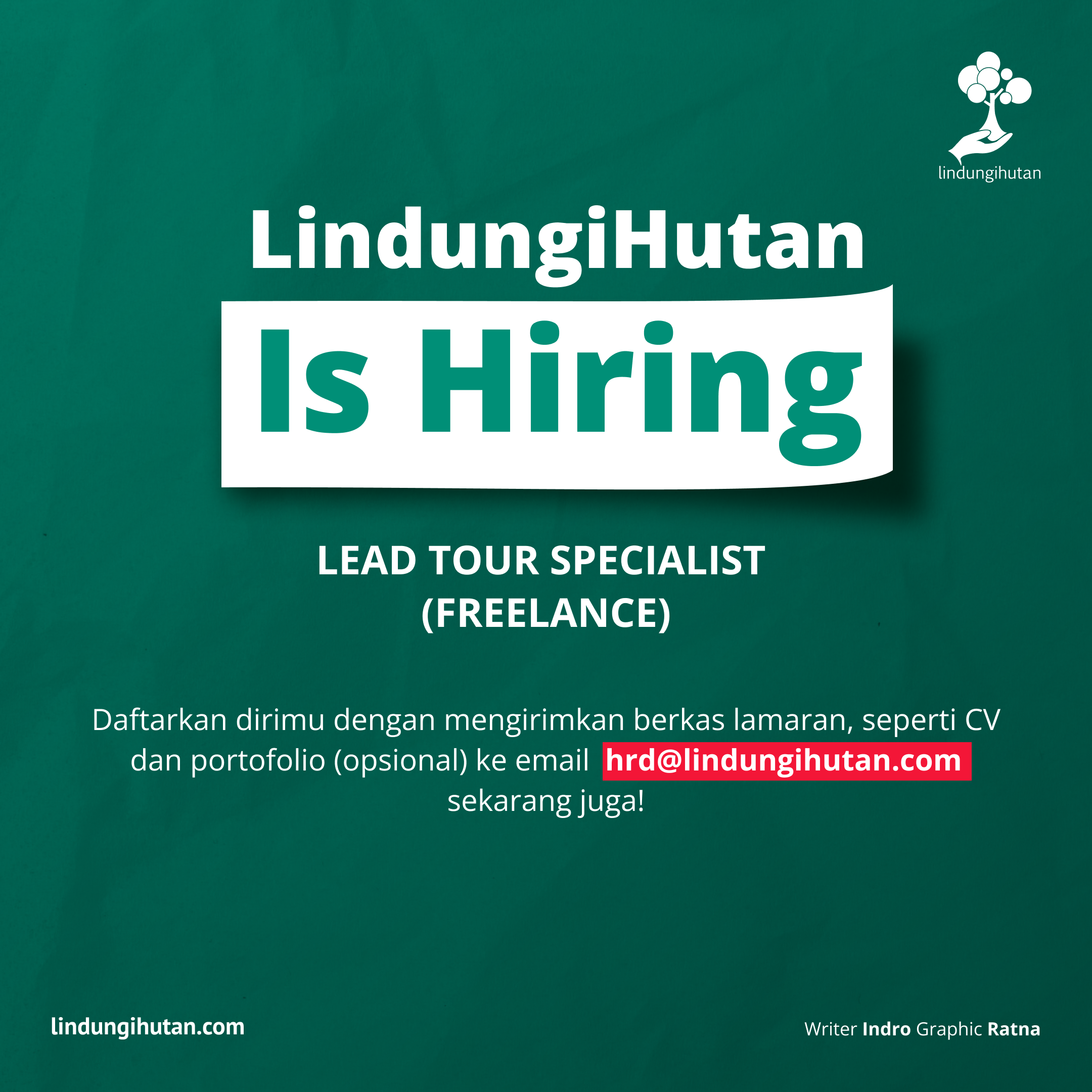 Dalam unggahan tersebut, LindungiHutan sedang mencari Freelancer Lead Tour Specialist yang dapat memandu dan mendampingi mitra hijau/klien dalam kegiatan penanaman pohon.