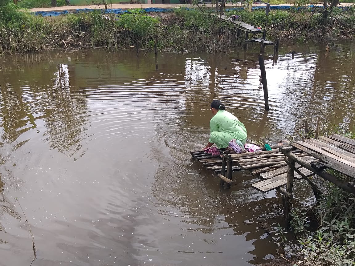 Kapuas,- Walaupun suami tercinta sedang bekerja membantu Satgas tmmd dalam melakukan pembangunan sasaran fisik, ibu Elma selalu menyempatkan diri untuk menyuci pakaian di sungai saat telah selesai memasak, Selasa (30/3/2921).