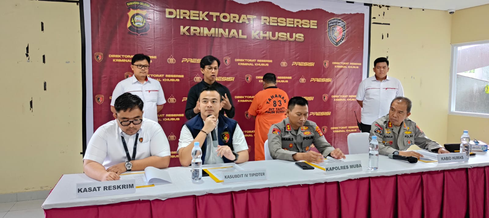 ‘Plh Kasubdit IV Tipiter Kompol Bayu Arya Sakti didampingi Kasubbid PID Bidhumas Polda Sumsel AKBP Suparlan, SH, MSi dan kapolres Musi Banyuasin AKBP Imam Syafii ,SIK,MSi mengatakan, polisi masih mengejar satu tersangka. “Ujarnya.