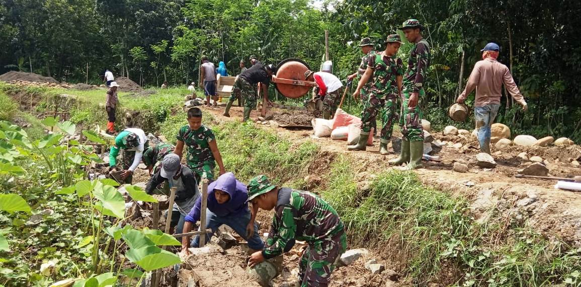 Di lokasi pembangunan talud di Dukuh Pepedan, Desa Pantirejo, tampak puluhan anggota Satgas TMMD dengan dibantu warga masyarakat desa setempat, bahu membahu mengejar target pembangunan talud itu.