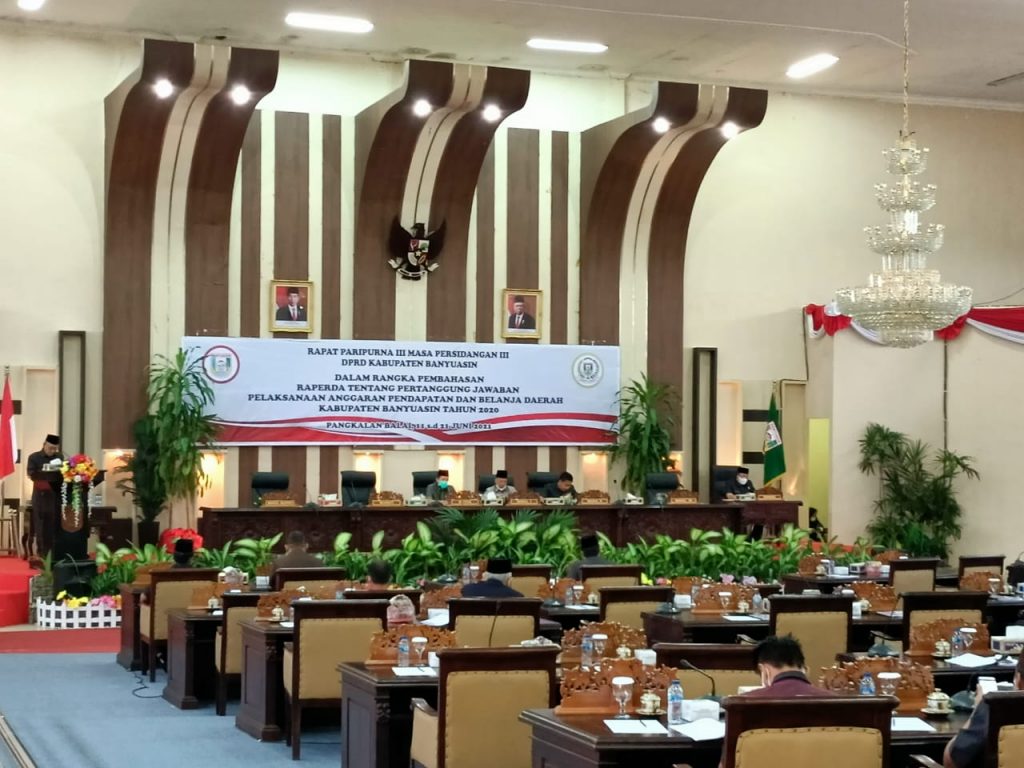 Banyuasin,newshanter.com – Setelah delapan fraksi DPRD Banyuasin menyampaikan pandangan umum terhadap Raperda pelaksanaan APBD Banyuasin tahun anggaran 2020, kemarin. Kini giliran tanggapan Bupati Banyuasin H Askolani yang disampaikan oleh Wakil Bupati H Slamet pada paripurna DPRD, Selasa (15/6/2021).