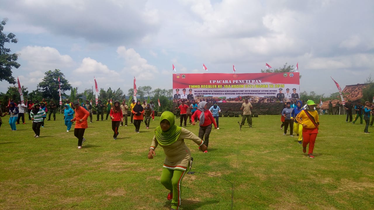 Ny. Sutarji, isteri dari personil TNI Koramil 01/Blora bersama ibu-ibu Persit lainnya begitu bersemangat mengikuti latihan tari Poco-poco dan Tobello disela-sela gladi bersih di lapangan Desa Nglengkir.