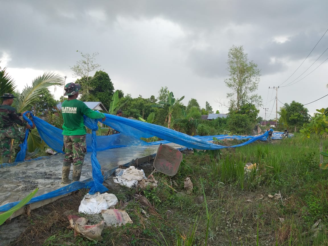 Kapuas,- Pengerjaan pengecoran jalan usaha tani yang terletak di Desa Saka Lagun, Kecamatan Pulau Petak, Kebupaten Kapuas, yang dikerjakan anggota TMMD reguler ke-110 Kodim 1011/KLK sudah masuk dalam tahap proses finishing baik pembersihan maupun kerapian yang lain, Minggu (28/3/2021).