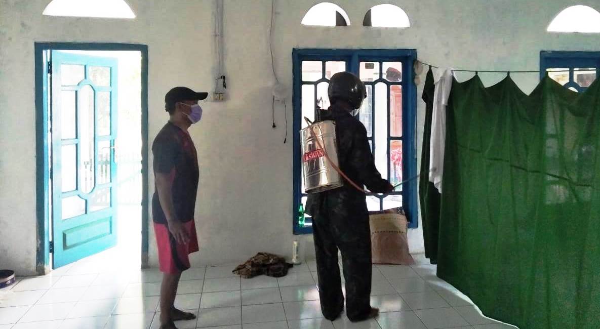 Seperti yang dilakukan Sabtu (27/03/2020), sejumlah anggota Satgas TMMD Reguler Kodim Pekalongan melakukan penyemprotan di Mushola Baitur Rohman, yang ada di Dukuh Jlubang, Desa Pantirejo. Di hari itu, sejumlah mushola yang ada di desa setempat juga dilakukan penyemprotan desinfektan. (rus)