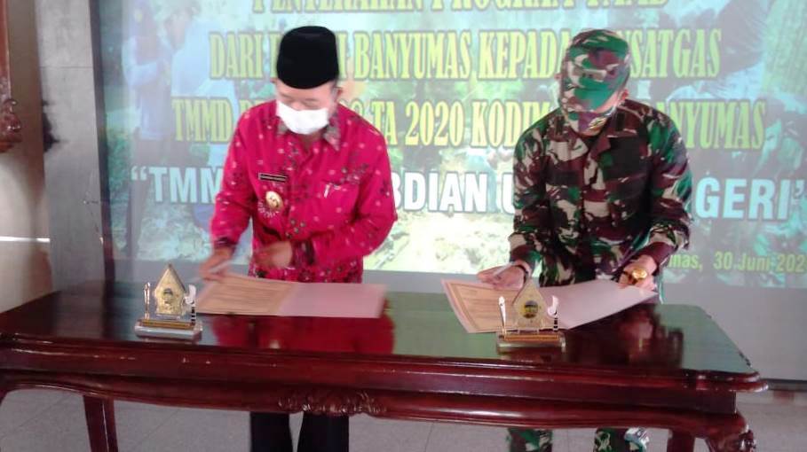 Diketahui, pembukaan TMMD Reguler ke-108 Kodim 0701/Banyumas, berlangsung sederhana. Yakni ditandai dengan penandatanganan naskah proyek TMMD antara Bupati Banyumas, Ir. H. Achmad Husen dengan Dandim 0701/Banyumas Letkol Inf Candra, S,E., M.I.Pol, di Pendopo Si Panji, Kabupaten Banyumas, Selasa (30/06/2020). (Ags)