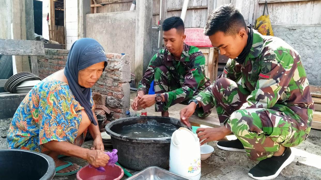 PURWODADI – Bu Marsih (53), salah satu warga Desa Tambakselo, Kecamatan Wirosari, Kabupaten Grobogan, Jawa Tengah, sempat tidak percaya dan setengah tidak enak hati, ketika beberapa Tentara yang sedang tugas di desanya, membantu cuci piring.