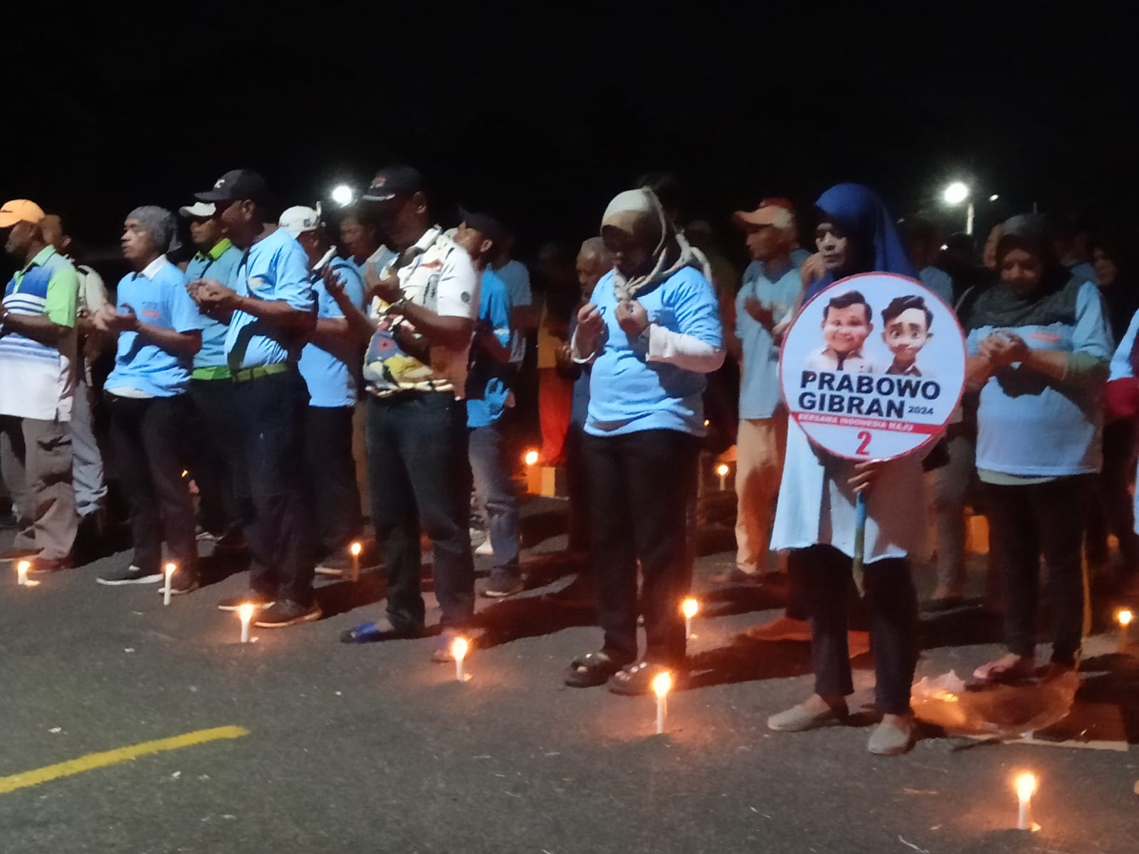 Ratusan orang berkumpul di lapangan The Royal PGC Golf Lounge dengan membawa lilin dan spanduk foto Prabowo – Gibran, sambil berdoa mereka juga melakukan sujud syukur atas kemenangan pasangan 02.