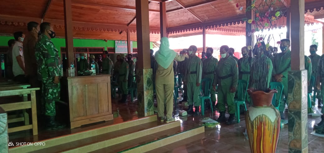 Bojonegoro – Saat melakukan kegiatan di Balaidesa Ngrancang Kecamatan Tambakrejo Kabupaten Bojonegoro para anggota satgas TMMD dan Linmas Desa Serta Satpol PP sedang menyanyikan lagu Indonesia raya, Selasa (30/3/2021).