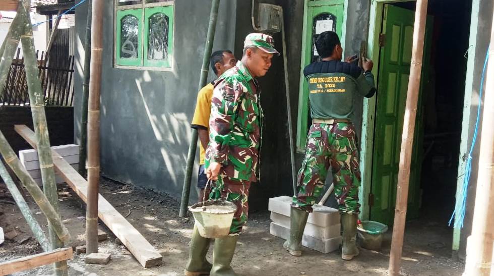 PEKALONGAN, Newshanter.com – TNI anggota Satgas TMMD Reguler ke-107 Kodim 0710/Pekalongan yang ahli tukang, Sertu Usman Gumato, terus sempurnakan proses perehaban rumah Rohmat (68), di Dukuh Sutosari RT 03/ RW 04, Desa Pantirejo, Kecamatan Kesesi, Kabupaten Pekalongan, Jawa Tengah.