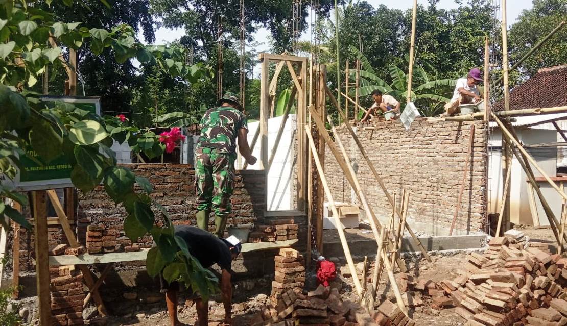 PEKALONGAN, Newshanter- Sejumlah anggota Satgas TMMD Reguler ke-107 Kodim 0710/Pekalongan, dengan dibantu warga, terus menaikan pasangan batu bata di rumah Sudarso (61), di Dukuh Jlubang RT 02/RW 05 Desa Pantirejo, Kecamatan, Kesesi, Kabupaten Pekalongan, Jawa Tengah . Mereka menjamin perehaban rumah itu akan rampung sebelum TMMD ditutup.