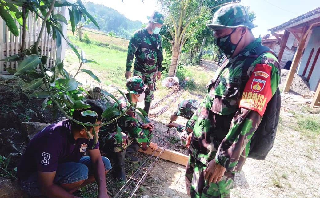 Begitu TMMD dibuka, Selasa (30/06/2020) sejumlah TNI anggota Satgas TMMD langsung merangkai kolom besi untuk penulangan beberapa tiang Mushola yang akan direhab itu, tampak sejumlah warga setempat juga membantu kegiatan itu.