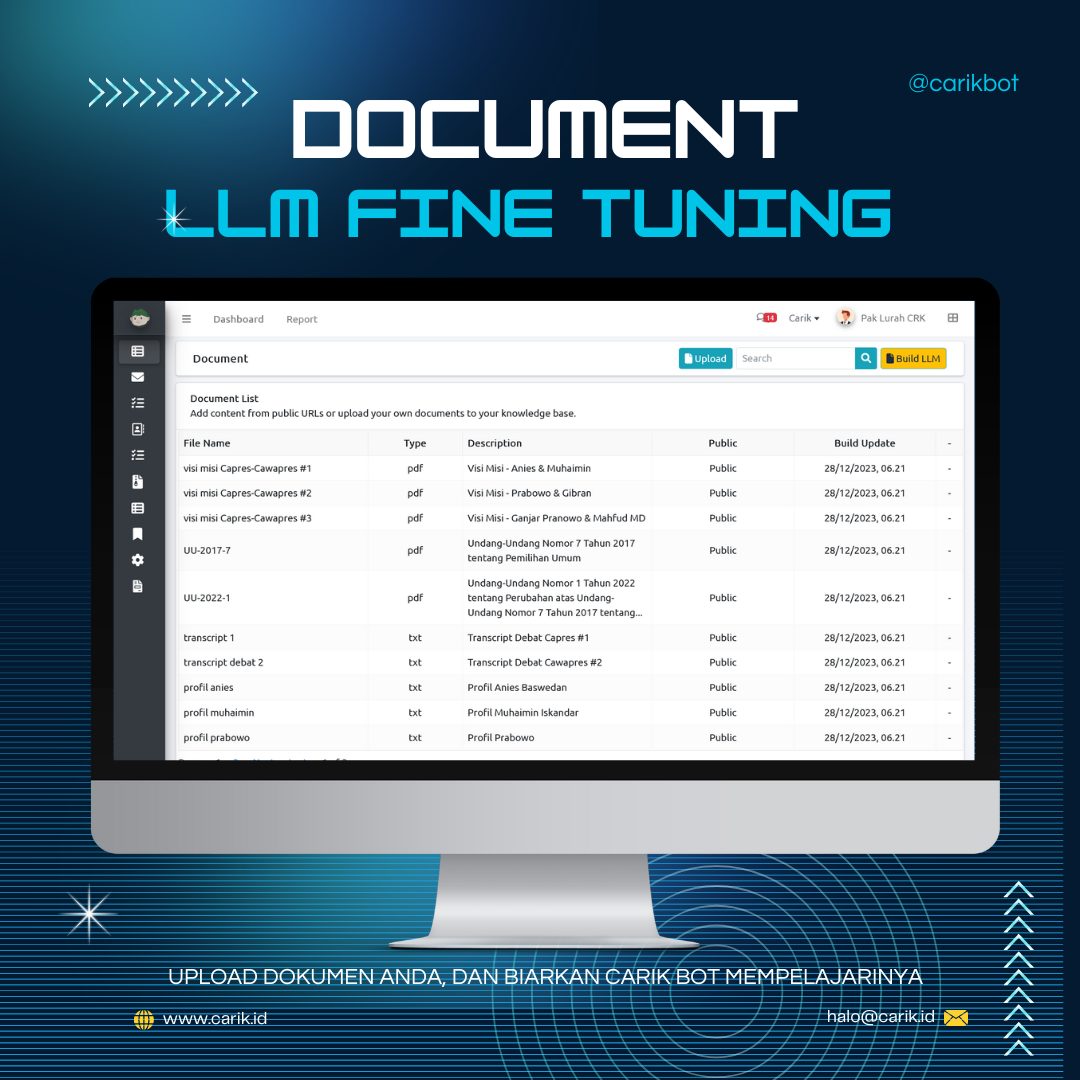 LLM (Large Language Model) Fine Tuning Dokumen bekerja dengan cara melatih chatbot Carik Bot pada kumpulan dokumen yang disediakan oleh pengguna. Dokumen ini dapat berupa berbagai macam format, seperti artikel berita, panduan pengguna, atau bahkan percakapan dengan pelanggan. Semakin banyak dokumen yang diunggah, semakin cerdas pula chatbot Carik Bot.