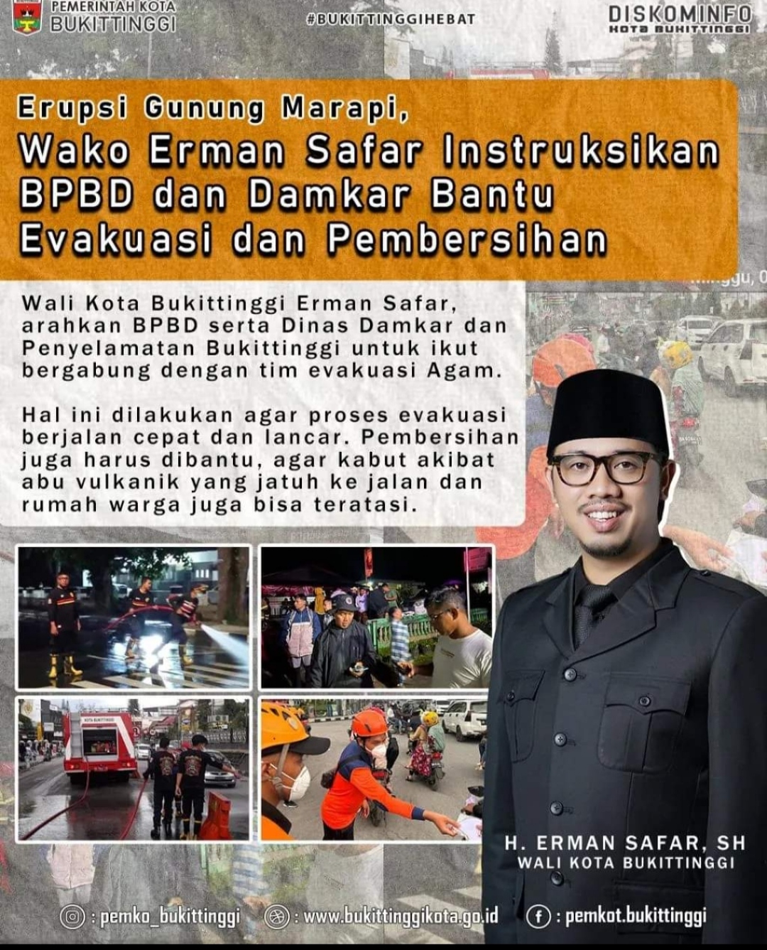 Wali Kota Bukittinggi Erman Safar, arahkan BPBD serta Dinas Damkar dan Penyelamatan Bukittinggi untuk ikut bergabung dengan tim evakuasi Agam.