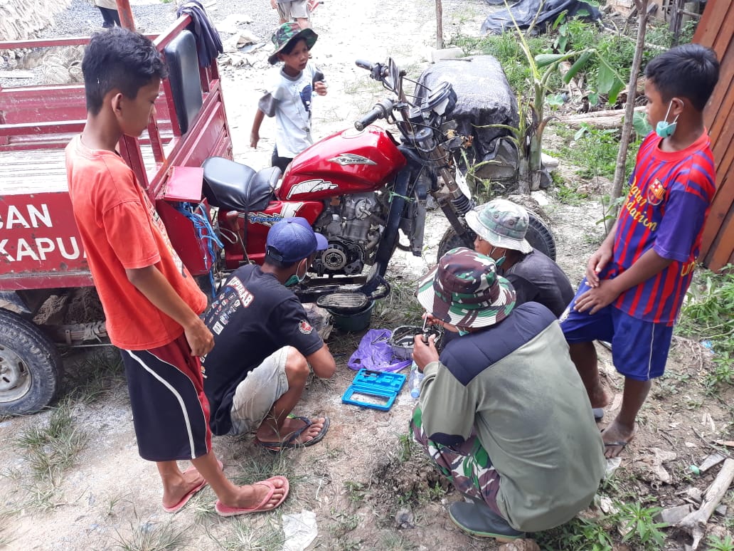Seperti yang di alami Deri kenderaan roda tiga milikinya mengalami gangguan pada rantai mesin sehingga perlu dilakukan perbaikan. Untuk itu anggota satgas Serda Purwanto membantu membetulkan motor milik Deri hingga sepeda motor itu bisa di gunakan kembali.