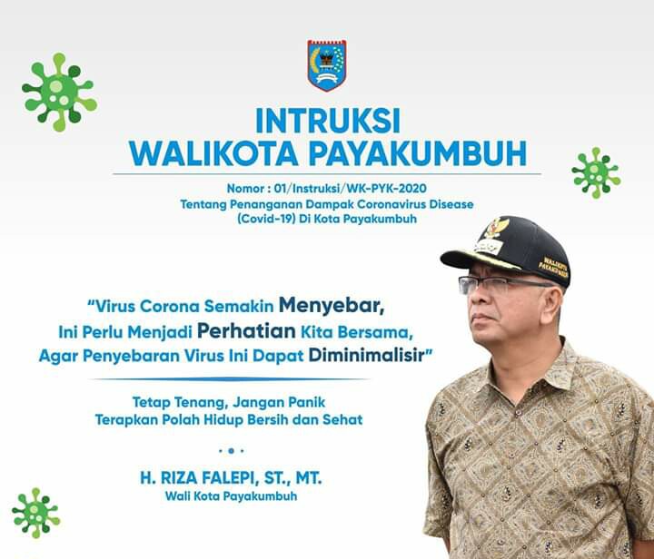 Payakumbuh -newshanter.com Pada hari Jumat (27/3/2020), Walikota Payakumbuh Riza Falepi mengeluarkan instruksi guna antisipasi penyebaran dan dampak dari virus Corona di Kota Payakumbuh.