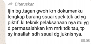 “Ijin bang, biarkan saja, karena dokumen saya lengkap. Barang sesuai spesifikasi, tidak ada yang fiktif. Kalau teknis pelaksanaan nya itu, yang dipermasalahkan, karena mereka tidak tahu. Tapi saya Innsha Allah sudah sesuai Juknis (Petunjuk Teknis) nya”.