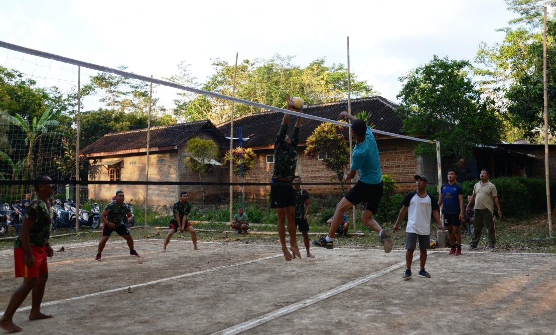 Setelah menyelesaikan pekerjaan pembangunan para personel Satgas TMMD kembali berbaur dengan warga untuk bermain bola voli.