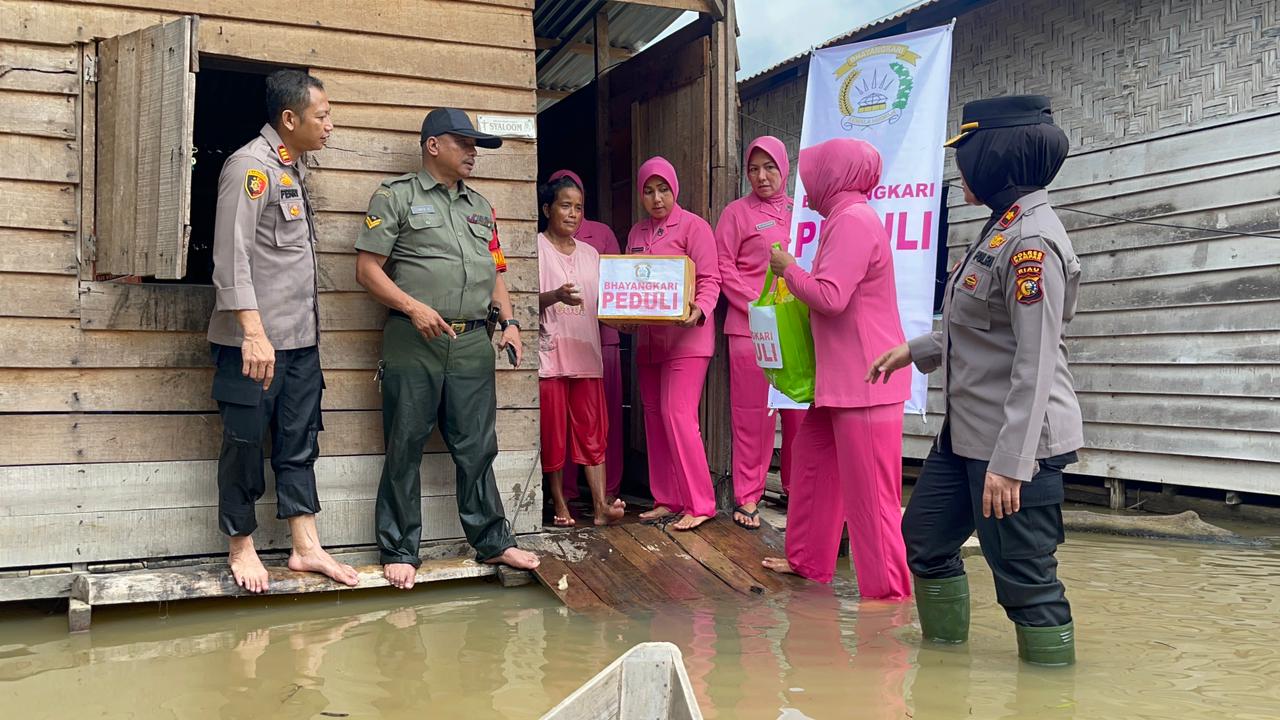 Kapolsek Tapung, Kompol Nursyafnita bersama tim berikan bansos dan obat-obatan serta Vitamin kepada Masyarakat yang terdampak akibat luapan aliran sungai Tapung di RT 02 RW 012 Dusun I, Desa Petapahan, Kecamatan Tapung, Kabupaten Kampar.