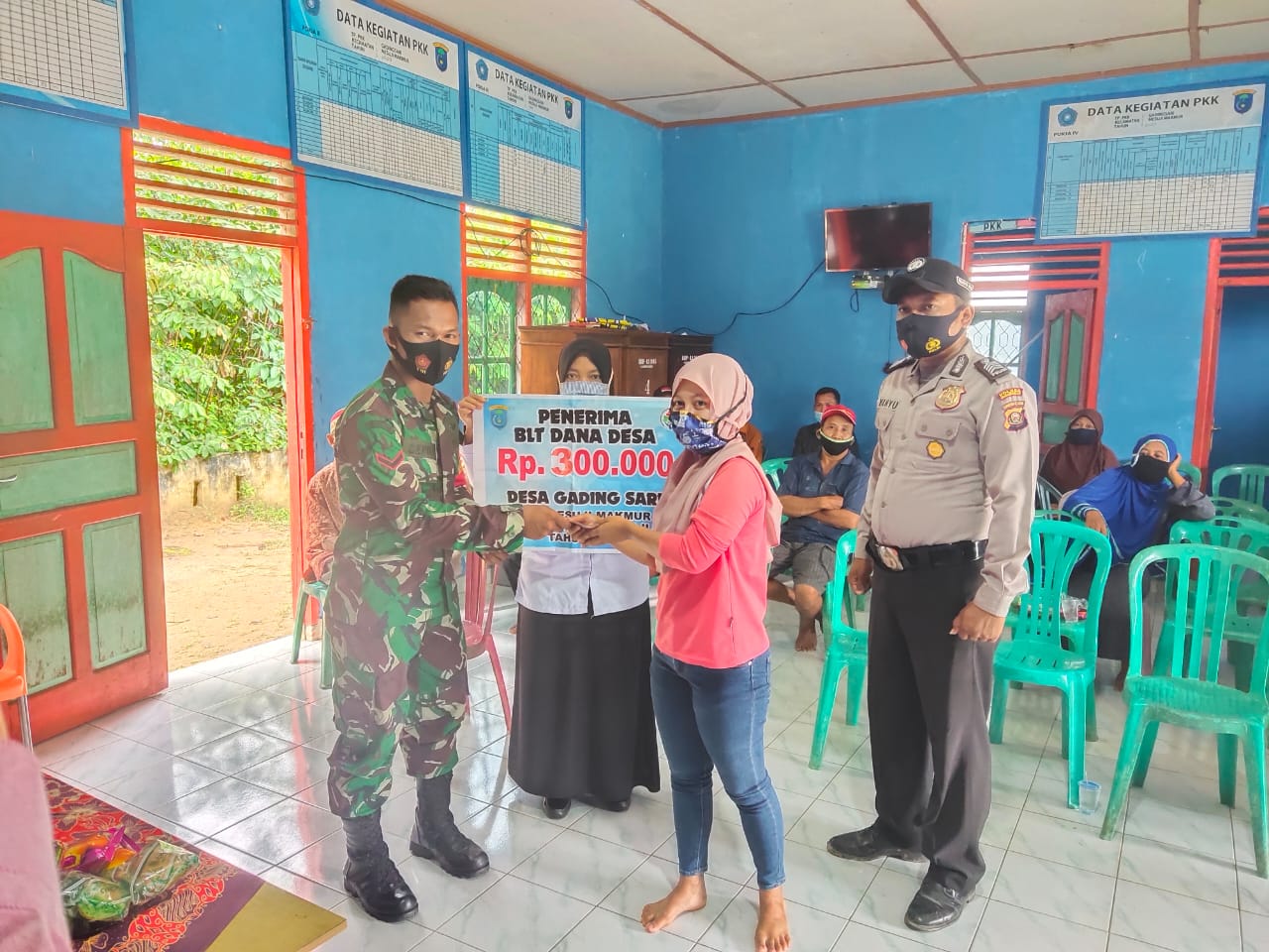 Serta mengantisipasi hal-hal yang tidak di inginkan pada saat penyaluran BLT DD, dan dalam kegiatan ini tetap menerapkan protokol kesehatan guna mencegah penyebaran Virus Corona, seperti wajib menggunakan masker, jaga jarak dan mencuci tangan dengan sabun di tempat yang telah disediakan oleh perangkat Desa.