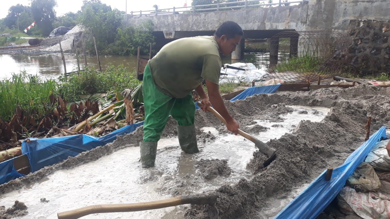 Meskipun badannya besar, namun dirinya tetap terus bekerja meratakan adonan semen untuk pemerataan semenisasi Jalan Usaha Tani sepanjang 1200 meter ini.