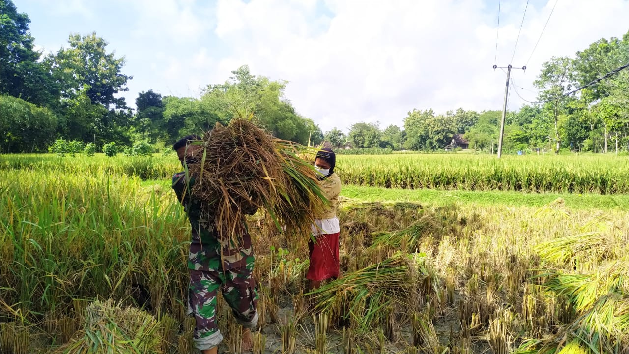 Bojonegoro-Satgas TNI Manunggal Membangun Desa (TMMD) ke-110 Kodim 0813/Bojonegoro turun ke sawah untuk membantu warga memanen padi.