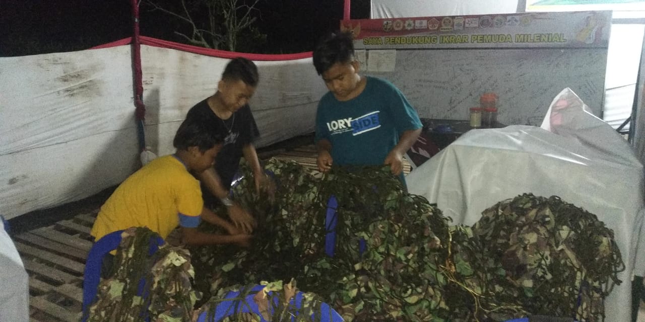 Terlihat anak – anak sedang memperbaiki bentuk Jaring Samaran yang ada di Pos Kotis TMMD Kodim 0418 sebelum di jemur.