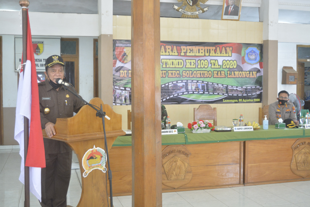 Dalam sambutannya bupati menyampaikan atas nama pribadi dan atas nama pemerintah Kabupaten Lamongan mengucapan terima kasih kepada Kodim 0812 Lamongan memilih Desa Tebluru Kec. Solokuro, Kab. Lamongan untuk di jadikan program TMMD ke 109 tahun 2020.