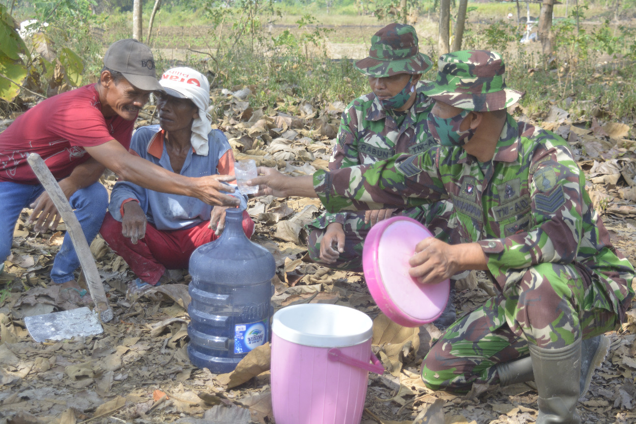 Tampak suasana kebersamaan dan kekeluargaan semakin terasa saat warga dan satga istirahat siang sambil menikmati air yang dibawa untuk melepas dahaga.