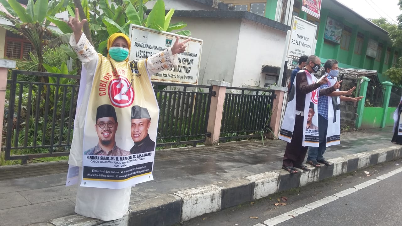 Bukittinggi, News hanter.com- Pasangan Calon Walikota dan wakil walikota dengan nomor Urut 2, H Erman safar- Marfendi, selain kampanye silaturahmi dor too dor kerumah warga, tim sukses juga gencar lakukan giat kampanye dengan menyapa warga Bukittinggi di jalan ala PKS dengan cara berpakaian spanduk Paslon Nomor urut 2 ( Flash Mob) , Sabtu (21/10/2020).