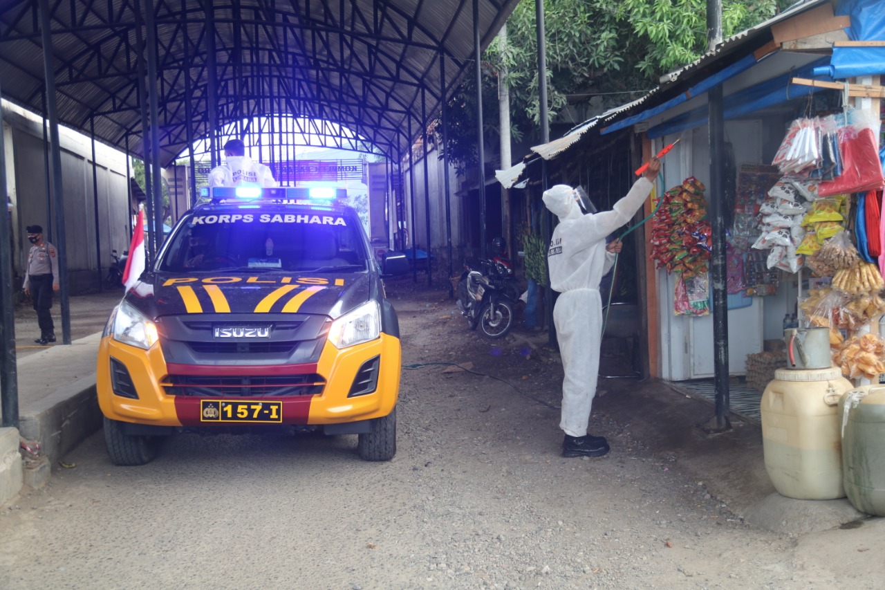Personel Ditsamapta Polda Aceh menyemprot cairan disinfektan di seputaran pasar Lambaro, Aceh Besar, Jum’at (02/10/2020), sekira pukul 17.00 wib hingga selesai.