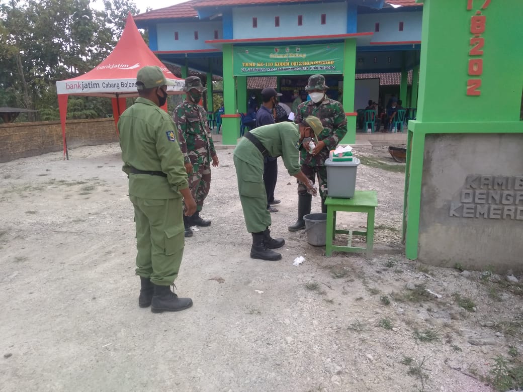 Seperti dalam kegiatan kali ini, anggota satgas TMMD ke-110 Kodim 0813/Bojonegoro Sertu Maskun dan Serda Sutriyono melakukan pendisiplinan cuci tangan kepada anggota Linmas Dusun Kalongan.