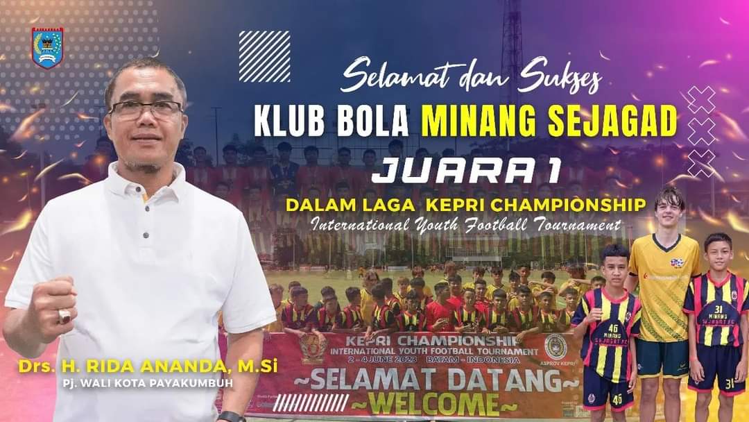 Payakumbuh, NEWSHANTER.COM — restasi Juara 1 yang diraih Minang Sejagat FC dalam Laga Kepri Championship International Youth Football Tournament yang diselenggarakan di Batam, 2 – 4 Juni 2023 menjadi kado terindah untuk Penjabat Wali Kota Payakumbuh Rida Ananda yang berulang tahun pada 7 Juni 2023.