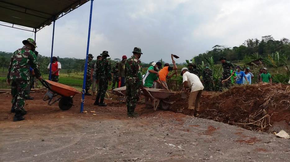 KARANGANYAR – Satgas TNI Manunggal Membangun Desa (TMMD) Reguler ke-109 Kodim 0727/Karanganyar Tahun Anggaran 2020 di Desa Jatiwarno, Kecamatan Jatipuro, Kabupaten Karanganyar bersama dengan warga tetap semangat meskipun cuaca desa tersebut sedang tidak bersahabat.