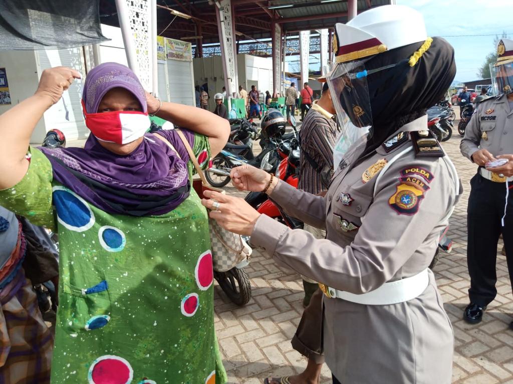Dalam rangka menyambut Hari Kemerdekaan ke-75 Republik Indonesia, personel Ditlantas Polda Aceh, Jum’at (14/8) membagikan 1000 masker merah putih sekaligus melakukan sosialisasi tentang penggunaan masker kepada pedagang dan pembeli di pasar Al-Mahirah Lamdingin, Kota Banda Aceh.
