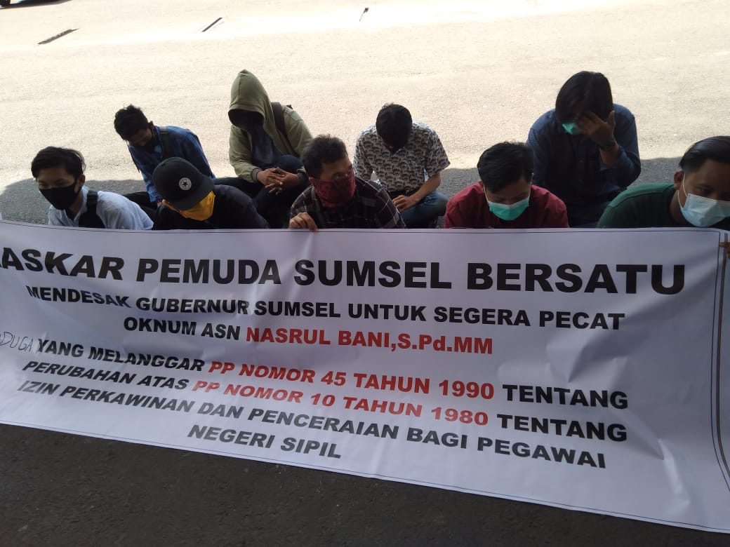 Palembang,newshanter.com – Puluhan pemuda, menggelar spanduk di depan pintu masuk pelataran gedung Kantor Gubernur Sumsel, dengan tuntutan mendesak Gubernur Sumsel untuk segera melakukan pemecatan oknum Aparatur Sipil Negara (ASN), Nasrul Bani, S.Pd., MM Kasi Dinas Pendidikan di Pendidikan Provinsi Sumsel) yang telah melanggar PP Nomor 45 Tahun 1990 tentang perubahan atas PP nomor Tahun 1980 tentang izin perkawinan dan perceraian bagi pegawai negeri.Jumat (16/10/2020).