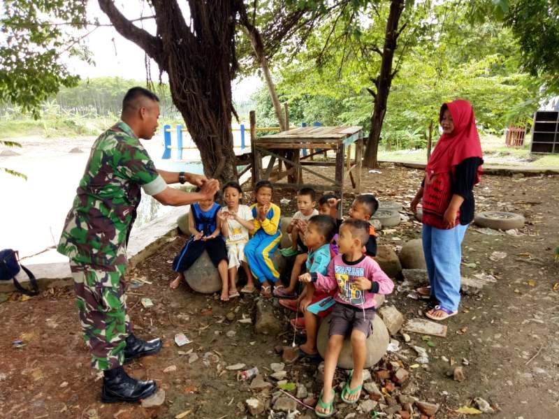 Terlihat Serda Tolani, memperagakan lipatan jari tangan hitungan dengan disaksikan murid PAUD Kartini Jatiroyom yaitu Kenzi (5), Akbar (6), Andi (6), Ozan (6), Izar (6) serta murid SD yaitu Anggi (7), Alih (8) dan Mutiara (8).