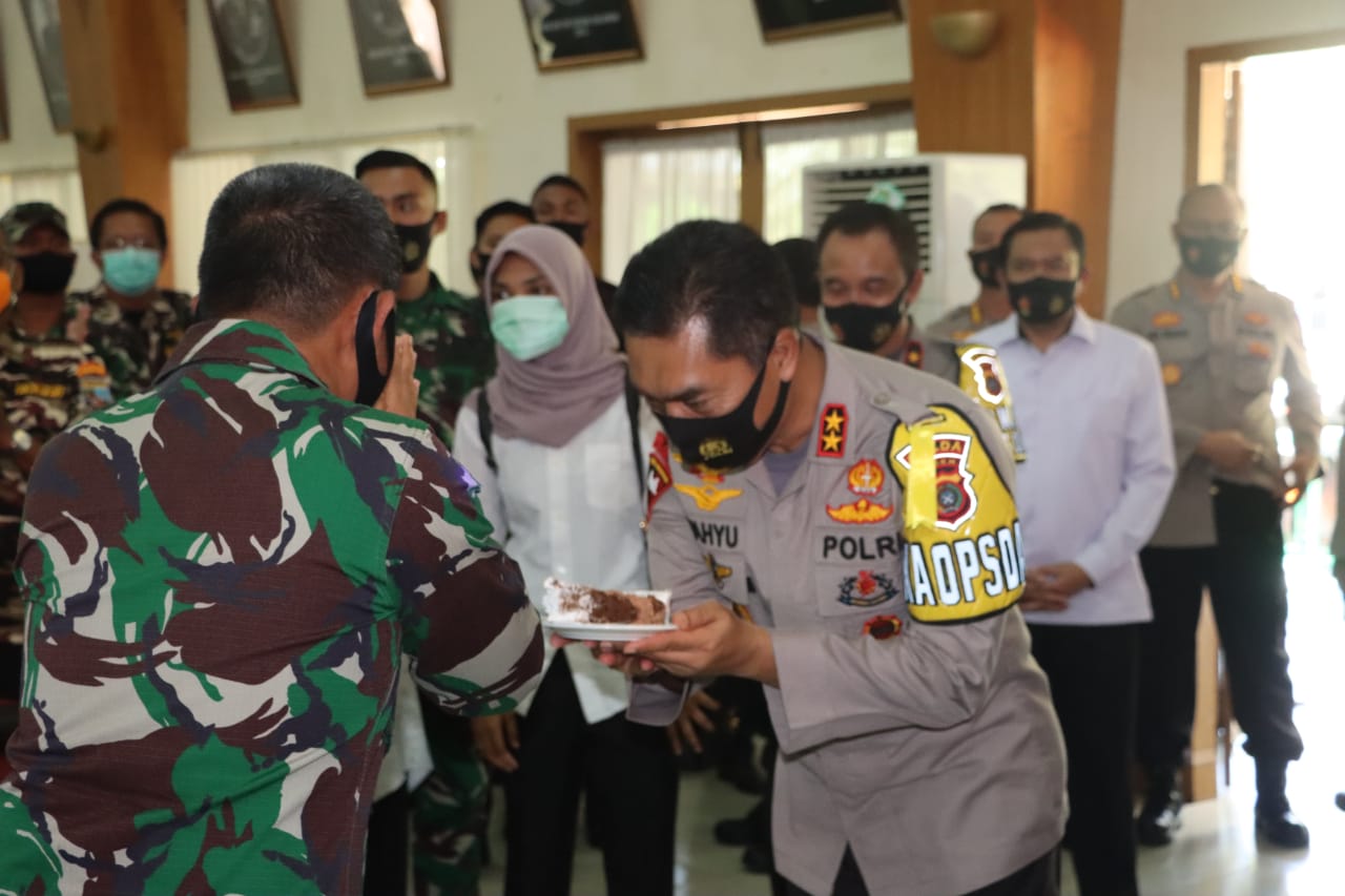 Kapolda Aceh Irjen Pol. Drs. Wahyu Widada, M. Phil, memberi suprise untuk Pangdam IM Mayjen TNI, Hassanudin, S. I. P., M. M dengan mengantar kue ulang tahun ke 55 Pangdam IM.