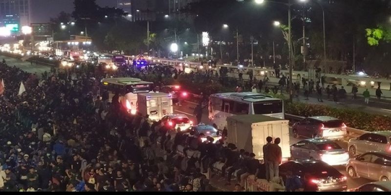 Selain itu berdasarkan pantauan CNNIndonesia.com, traffic cone yang dibakar itu berada di jalan tol dalam kota arah Slipi, Jakarta Barat.