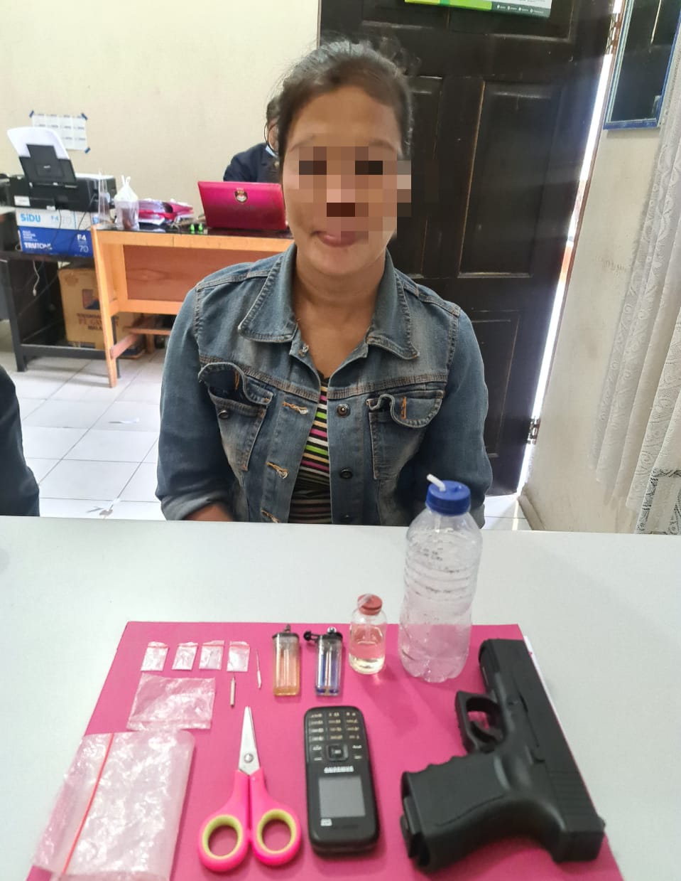 Bersama pelaku turut diamankan barang bukti 4 paket kecil narkotika jenis shabu terbungkus plastik bening, 2 buah bong, 1 pucuk air softgun dan beberapa peralatan penggunaan shabu serta 1 unit Hp merk Samsung yang digunakannya.