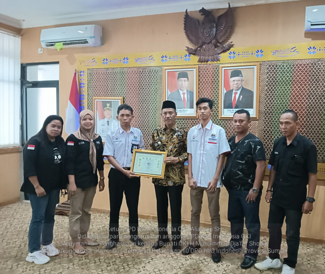 Penyerahan Penghargaan DPW IWO Indonesia Provinsi Sumsel kepada Bupati OKI tersebut dilakukan pada Kamis (11/01/2024) bertempat di Ruang Rapat Bupati OKI Provinsi Sumatera Selatan (Sumsel). Penghargaan diterima langsung oleh Bupati OKI H Muhammad Dja’far Shodiq yang diberikan melalui Ketua DPD IWO Indonesia Kabupaten OKI, Aliaman SH.